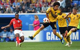 Чемпионат мира по футболу в России FIFA 2018. Матч за 3-е место между сборными командами Бельгии и Англии на стадионе "Санкт-Петербург". Игрок сборной Бельгии Тоби Алдервейрелд (справа) и игрок сборной Англии Рахим Стерлинг (слева) во время матча.