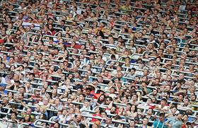 Чемпионат мира по футболу в России FIFA 2018. Матч за 3-е место между сборными командами Бельгии и Англии на стадионе "Санкт-Петербург". Болельщики на трибуне во время матча.
