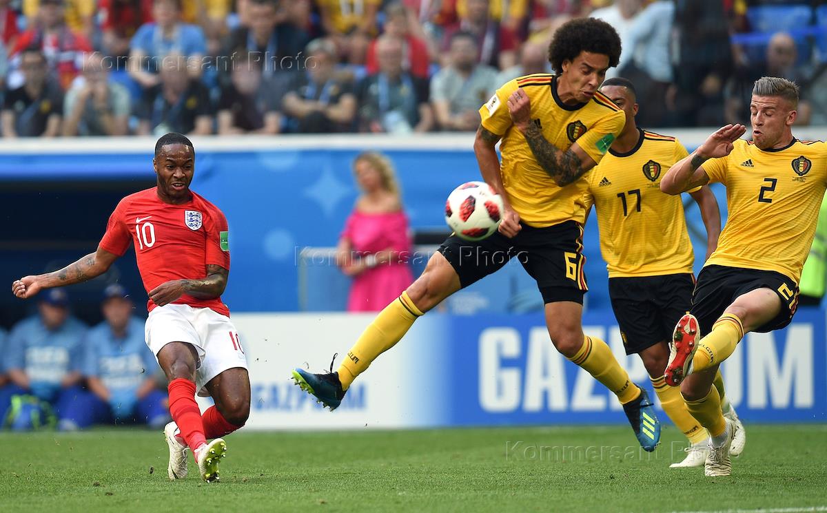 Чемпионат мира по футболу в России FIFA 2018. Матч за 3-е место между сборными командами Бельгии и Англии на стадионе "Санкт-Петербург". Слева направо: игрок сборной Англии Рахим Стерлинг, игроки сборной Бельгии Аксель Витсель и Тоби Алдервейрелд во время матча.