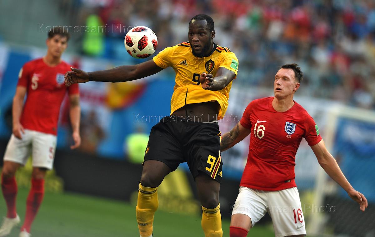 Чемпионат мира по футболу в России FIFA 2018. Матч за 3-е место между сборными командами Бельгии и Англии на стадионе "Санкт-Петербург". Игрок сборной Бельгии Ромелу Лукаку (слева) и игрок сборной Англии Фил Джонс (справа) во время матча.