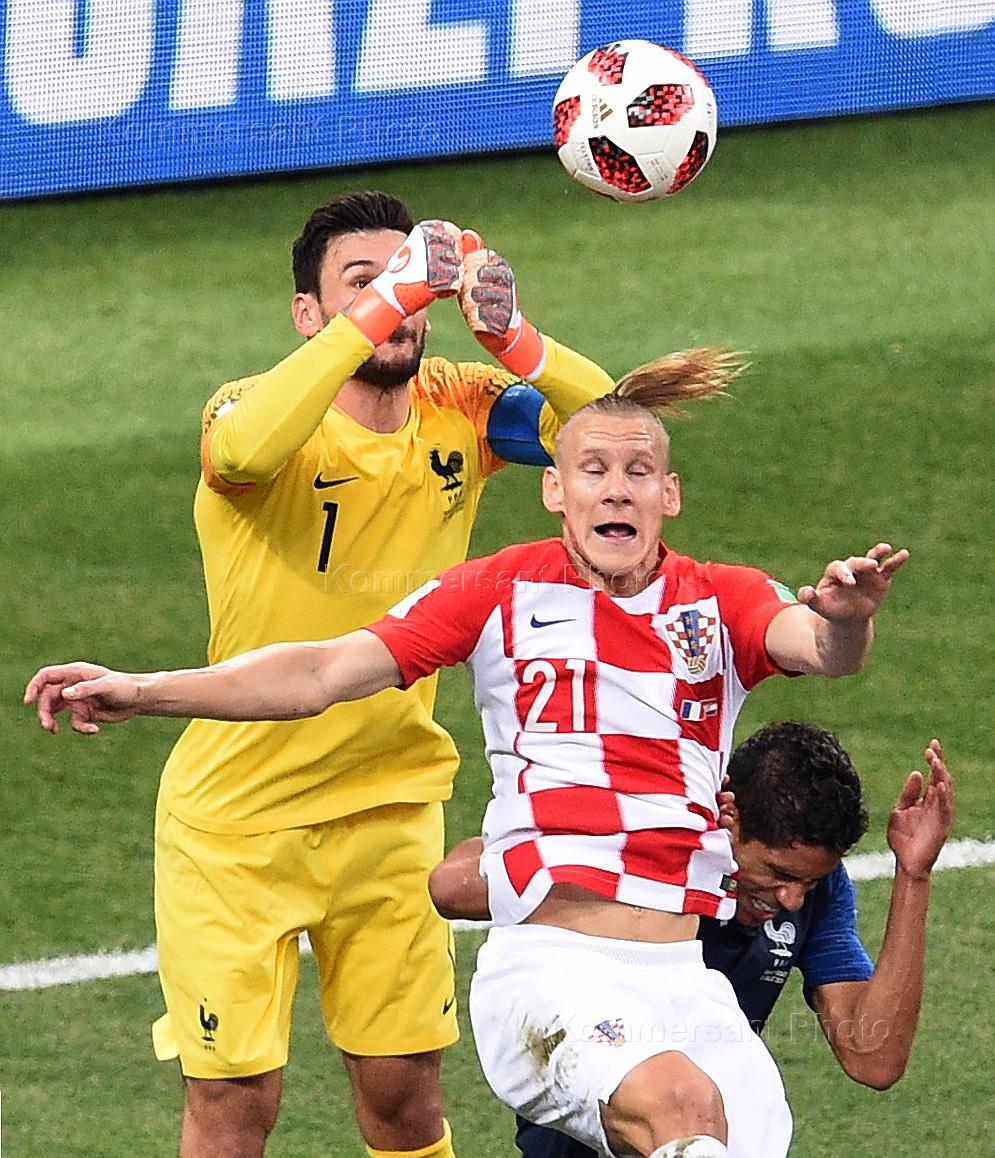 Чемпионат мира по футболу в России FIFA 2018. Финал. Матч между сборными Франции и Хорватии на стадионе "Лужники". Вратарь сборной Франции Уго Льорис (слева) и игрок сборной Хорватии Домагой Вида (в центре) во время матча.