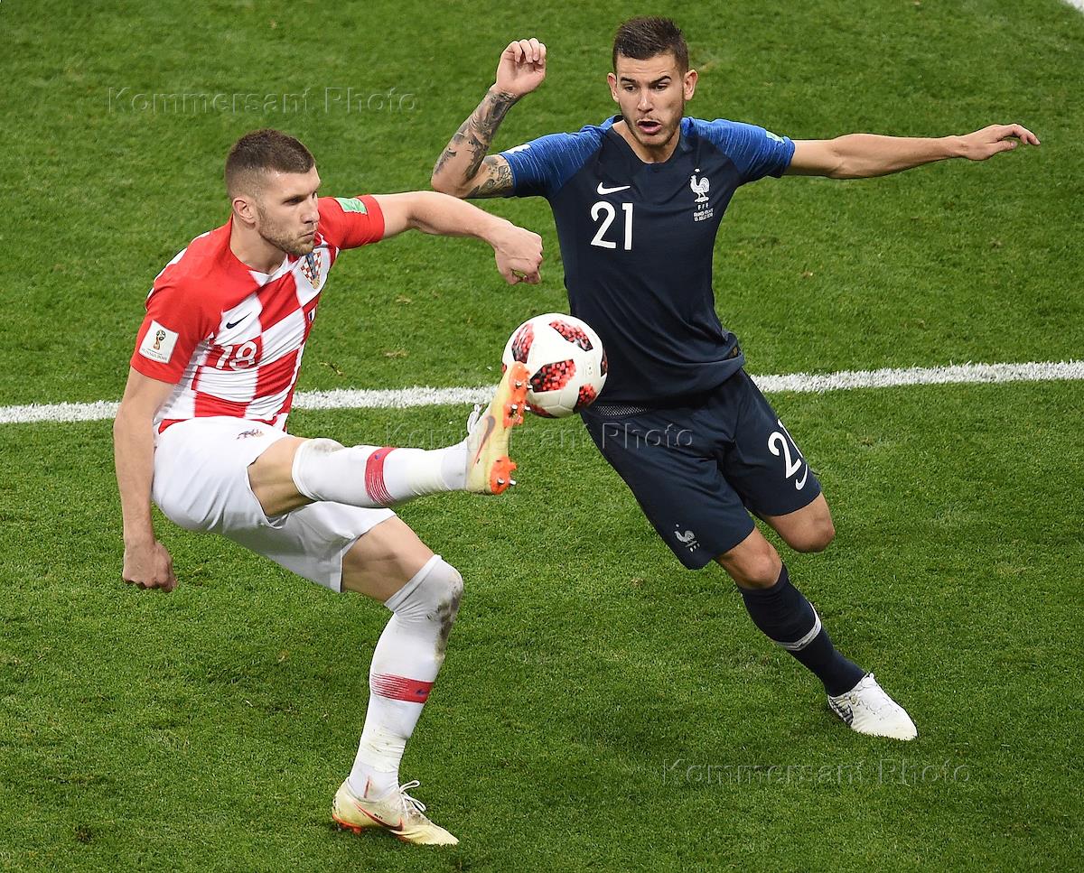 FIFA World Cup 2018 Russia. Final. France v Croatia at Luzhniki stadium. Croatian football player Ante Rebic (left) and French football player Lucas Hernandez (right) during the match.