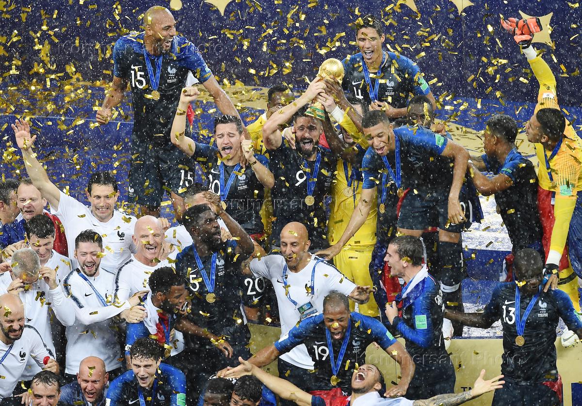 FIFA World Cup 2018 Russia. Final. France v Croatia at Luzhniki stadium. French football team after the match during the award ceremony.