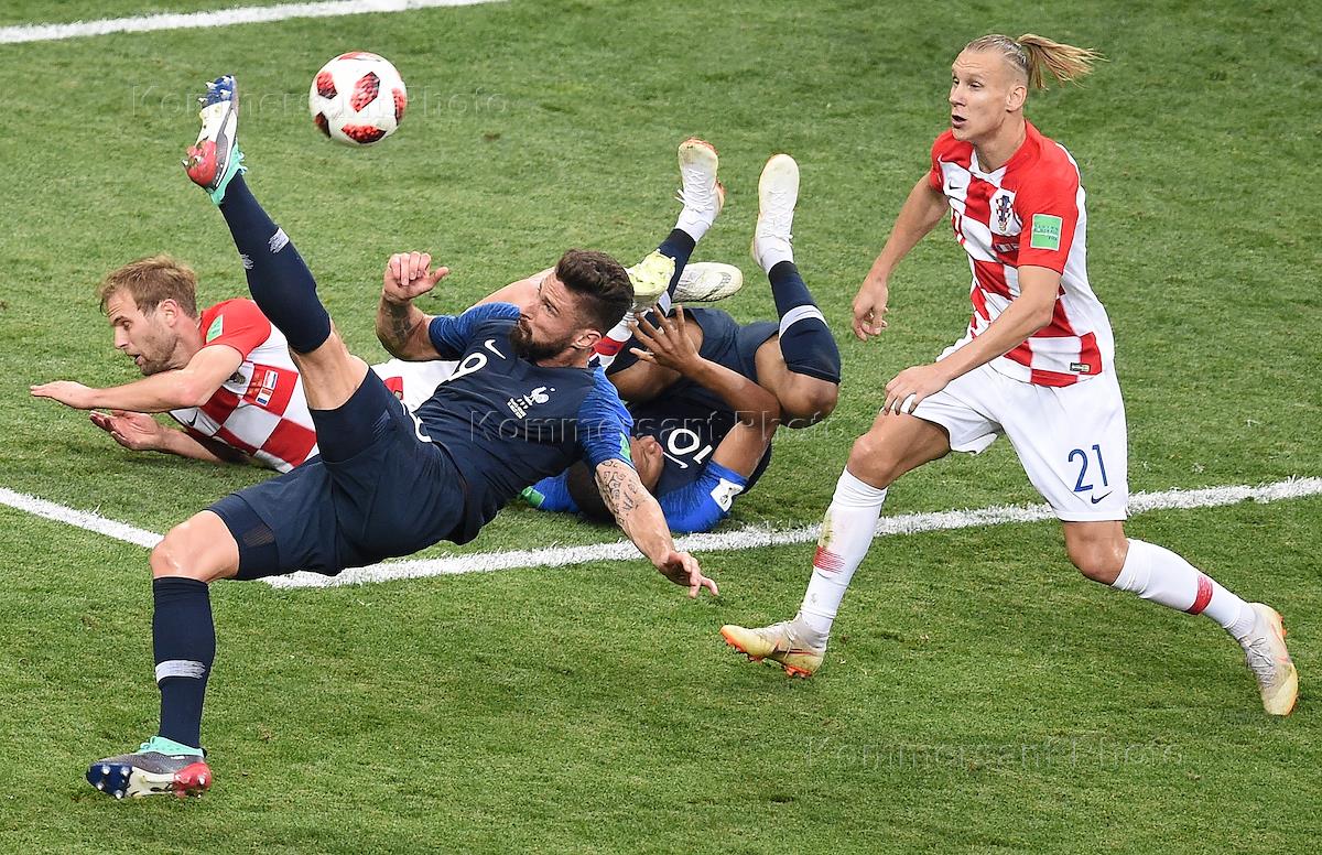Чемпионат мира по футболу в России FIFA 2018. Финал. Матч между сборными Франции и Хорватии на стадионе "Лужники". Игрок сборной Франции Оливье Жиру (в центре) во время матча.