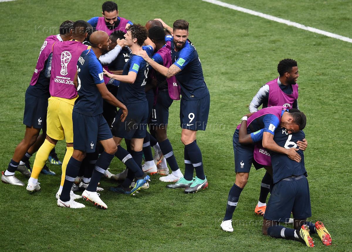 Чемпионат мира по футболу в России FIFA 2018. Финал. Матч между сборными Франции и Хорватии на стадионе "Лужники". Игроки сборной Франции во время матча.