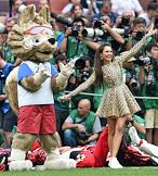 Чемпионат мира по футболу в России FIFA 2018. Церемония закрытия прошла на стадионе "Лужники" перед финальным матчем между сборными Франции и Хорватии. Оперная певица Аида Гарифуллина (справа) и официальный талисман чемпионата мира по футболу - 2018 Волк Забивака во время церемонии.