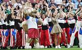 Чемпионат мира по футболу в России FIFA 2018. Церемония закрытия прошла на стадионе "Лужники" перед финальным матчем между сборными Франции и Хорватии. Оперная певица Аида Гарифуллина (в центре, справа) и официальный талисман чемпионата мира по футболу - 2018 Волк Забивака во время церемонии.