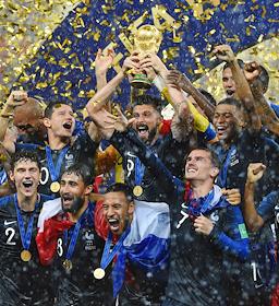 Чемпионат мира по футболу в России FIFA 2018. Финал. Матч между сборными Франции и Хорватии на стадионе "Лужники". Игроки сборной Франции после окончания матча.