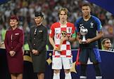 Чемпионат мира по футболу в России FIFA 2018. Финал. Матч между сборными Франции и Хорватии на стадионе "Лужники". Церемония награждения после окончания матча. Игрок сборной Хорватии Лука Модрич (второй справа) и игрок сборной Франции Килиан Мбаппе (справа) во время церемонии.