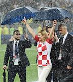 Чемпионат мира по футболу в России FIFA 2018. Финал. Матч между сборными Франции и Хорватии на стадионе "Лужники". Церемония награждения после окончания матча. Президент Хорватии Колинда Грабар-Китарович (в центре) во время церемонии.