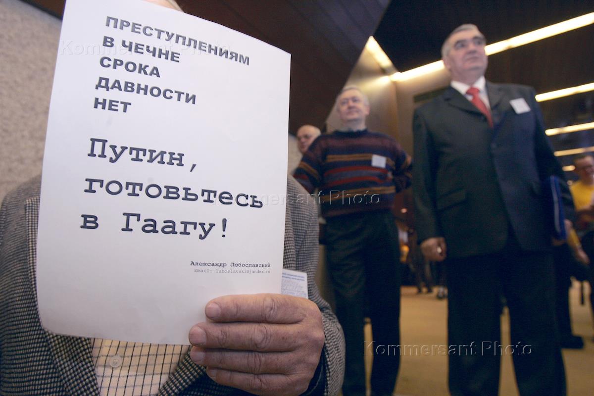 Всероссийский гражданский конгресс "Россия за демократию, против диктатуры". Конгресс объединенной правой и левой оппозиции прошел в гостинице "Космос". Участник конгресса с плакатом "Преступлениям в Чечне срока давности нет. Путин, готовьтесь в Гаагу!".