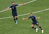 Чемпионат мира по футболу в России FIFA 2018. Финал. Матч между сборными командами Франции и Хорватии на стадионе "Лужники". Игроки сборной Франции Килиан Мбаппе (справа) и Оливье Жиру (слева) во время матча.