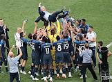 Чемпионат мира по футболу в России FIFA 2018. Финал. Матч между сборными командами Франции и Хорватии на стадионе "Лужники". Церемония награждения победителей. Игроки сборной Франции качают главного тренера Дидье Дешама.