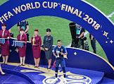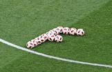 Чемпионат мира по футболу в России FIFA 2018. Финал. Матч между сборными командами Франции и Хорватии на стадионе "Лужники". Футбольные мячи на поле в виде буквы F.
