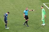 Чемпионат мира по футболу в России FIFA 2018. Финал. Матч между сборными Франции и Хорватии прошел на стадионе "Лужники". Игрок сборной Франции Антуан Гризманн (слева), вратарь сборной Хорватии Даниэль Субашич (справа) и арбитр Нестор Питана (в центре) во время матча.