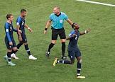 Чемпионат мира по футболу в России FIFA 2018. Финал. Матч между сборными Франции и Хорватии прошел на стадионе "Лужники". Игроки сборной Франции Антуан Гризманн (слева), Килиан Мбаппе (второй слева), Поль Погба (справа) и арбитр Нестор Питана (второй справа) во время матча.