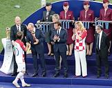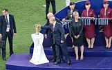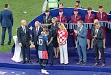 Чемпионат мира по футболу в России FIFA 2018. Финал. Матч между сборными Франции и Хорватии прошел на стадионе "Лужники". Церемония награждения после окончания матча. Слева направо: президент FIFA Джанни Инфантино, игрок сборной Хорватии Лука Модрич, президент России Владимир Путин, президент Франции Эммануэль Макрон, президент Хорватии Колинда Грабар-Китарович и Президент Федерации футбола Франции (FFF) Ноэль Ле Гре во время церемонии.