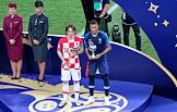 Чемпионат мира по футболу в России FIFA 2018. Финал. Матч между сборными Франции и Хорватии прошел на стадионе "Лужники". Церемония награждения после окончания матча. Игрок сборной Хорватии Лука Модрич (слева) и игрок сборной Франции Килиан Мбаппе (справа) во время церемонии.