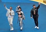 Чемпионат мира по футболу в России FIFA 2018. Церемония закрытия. Слева направо: американский актер Уилл Смит, албанская певица Эра Истрефи и американский певец Ники Джем во время выступления на церемонии.