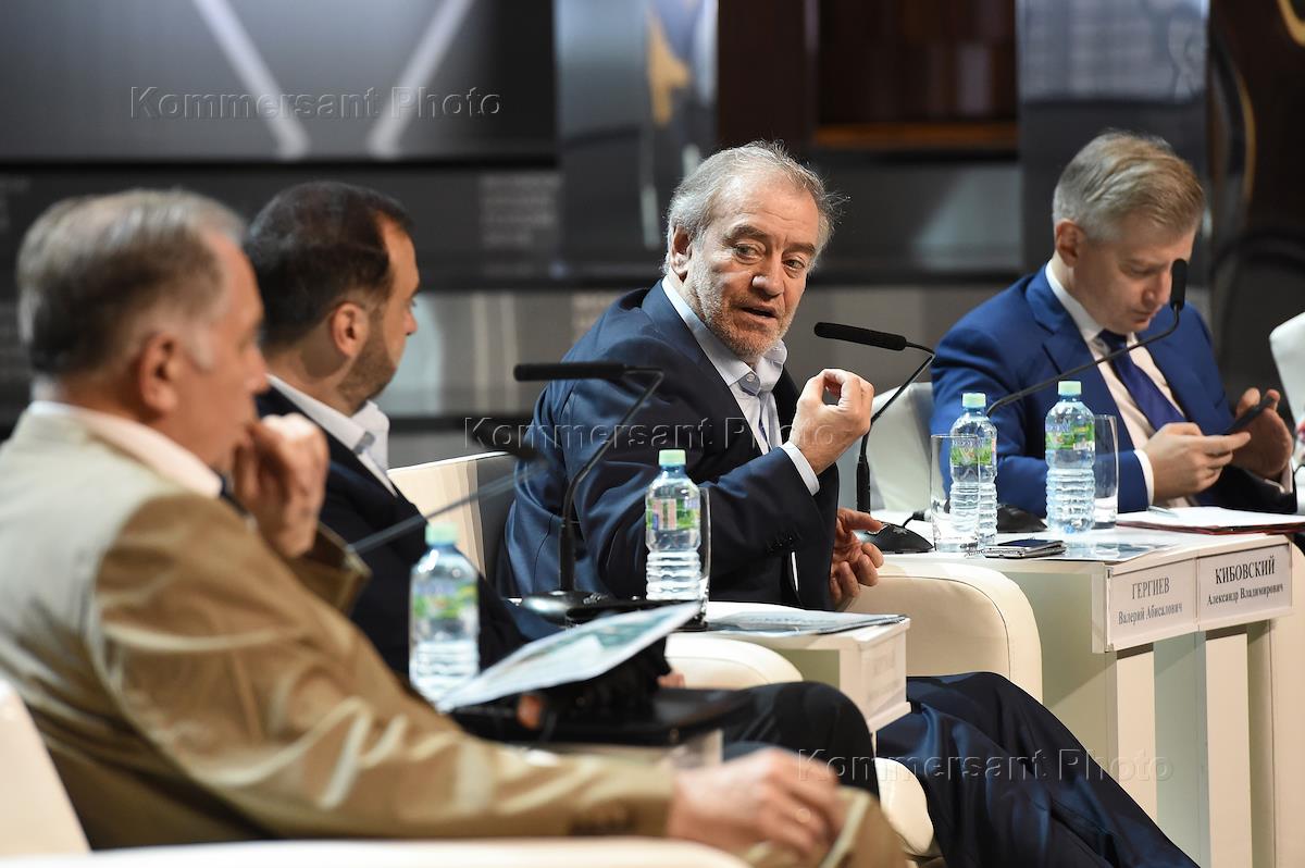 Пресс-конференция, посвященная презентации мультифункционального концертного комплекса "Зарядье", репертуарной политике нового зала, старту продажи билетов в большом зале Московского концертного зала "Зарядье". Художественный руководитель Мариинского театра Валерий Гергиев (в центре) во время пресс-конференции.