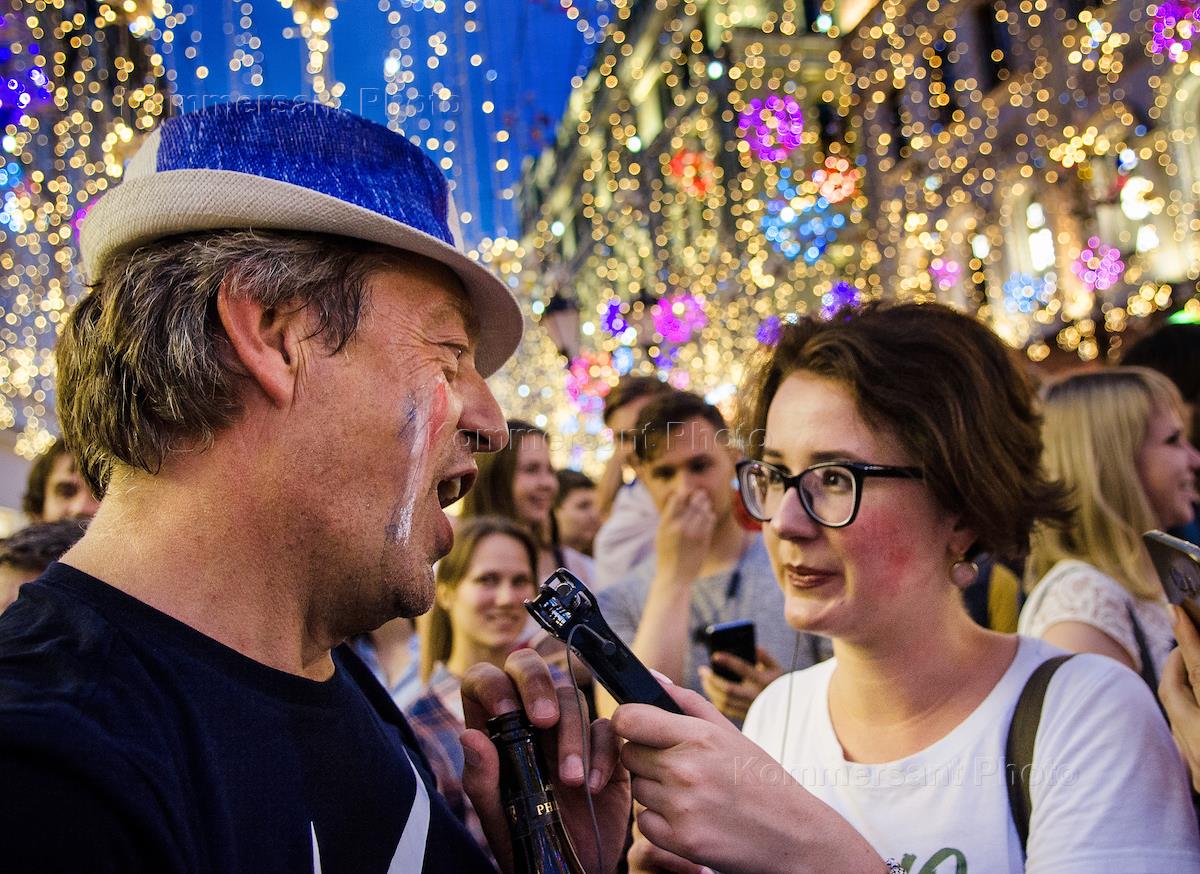 Чемпионат мира по футболу в России FIFA 2018. Финал. Матч между сборными Хорватии и Франции на стадионе "Лужники". Болельщик после матча на Никольской улице.