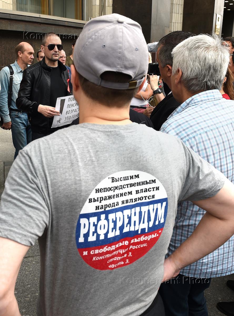 Акция протеста против повышения пенсионного возраста прошла у здания Государственной думы России. Помощник депутата ГД России Дениса Парфенова по работе в Москве Владимир Обуховский во время акции.