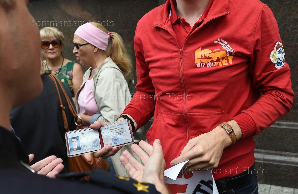 Акция протеста против повышения пенсионного возраста прошла у здания Государственной думы России. Помощник депутата ГД России Дениса Парфенова по работе в Москве Владимир Обуховский показывает удостоверение сотруднику полиции во время акции.