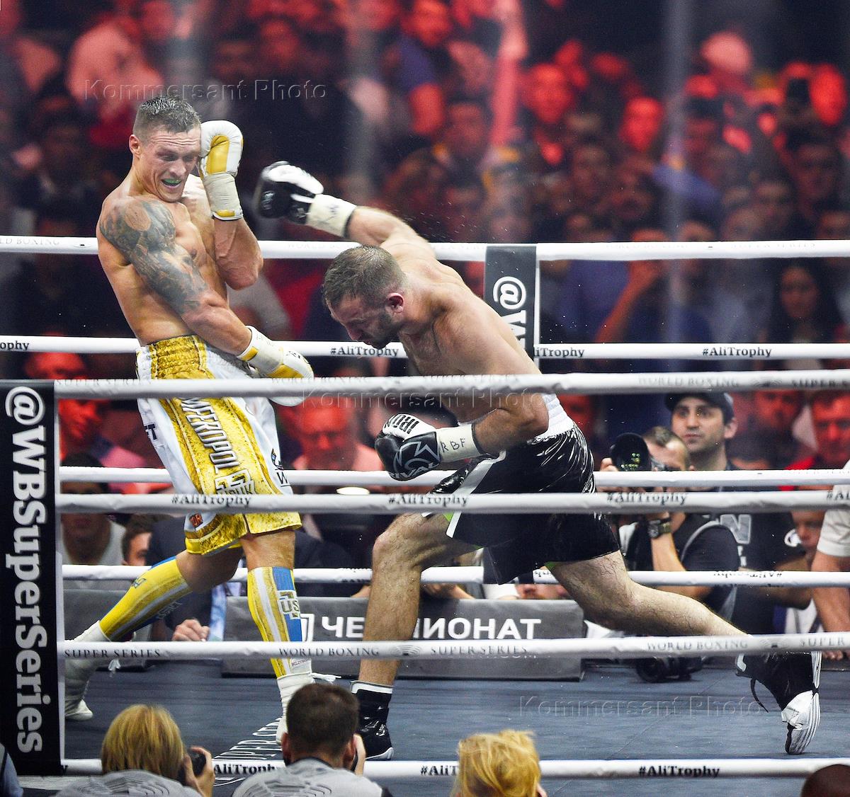 Всемирная боксерская суперсерия WBSS за титул чемпиона мира по версиям Всемирного боксерского совета (WBC), Всемирной боксерской организации (WBO), Всемирной боксерской ассоциации (WBA) и Международной боксерской федерации (IBF) в весе до 90,71 кг. Финал. Российский боксер Мурат Гассиев (справа) и украинский боксер Александр Усик (слева) во время объединительного боя в спортивном комплексе "Олимпийский".