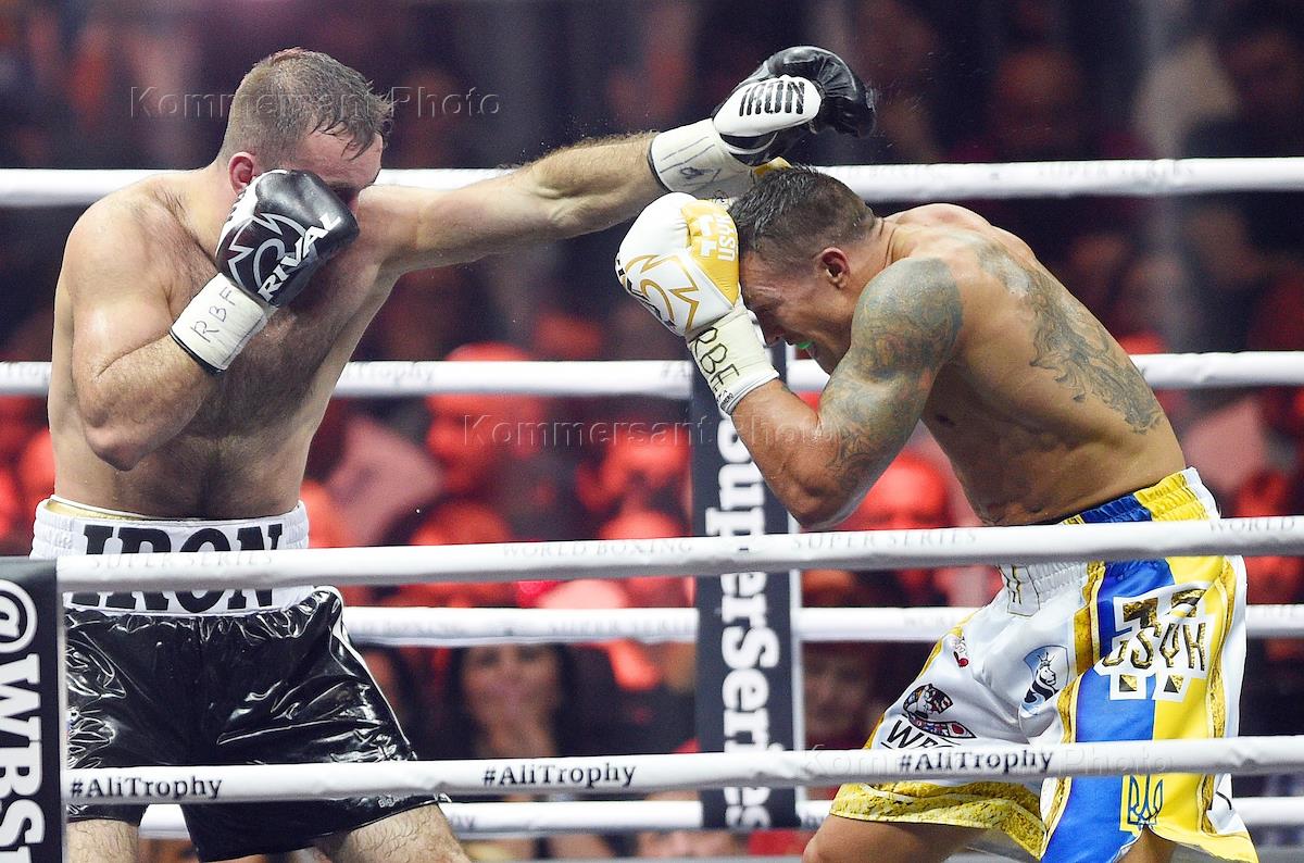 Всемирная боксерская суперсерия WBSS за титул чемпиона мира по версиям Всемирного боксерского совета (WBC), Всемирной боксерской организации (WBO), Всемирной боксерской ассоциации (WBA) и Международной боксерской федерации (IBF) в весе до 90,71 кг. Финал. Российский боксер Мурат Гассиев (слева) и украинский боксер Александр Усик (справа) во время объединительного боя в спортивном комплексе "Олимпийский".