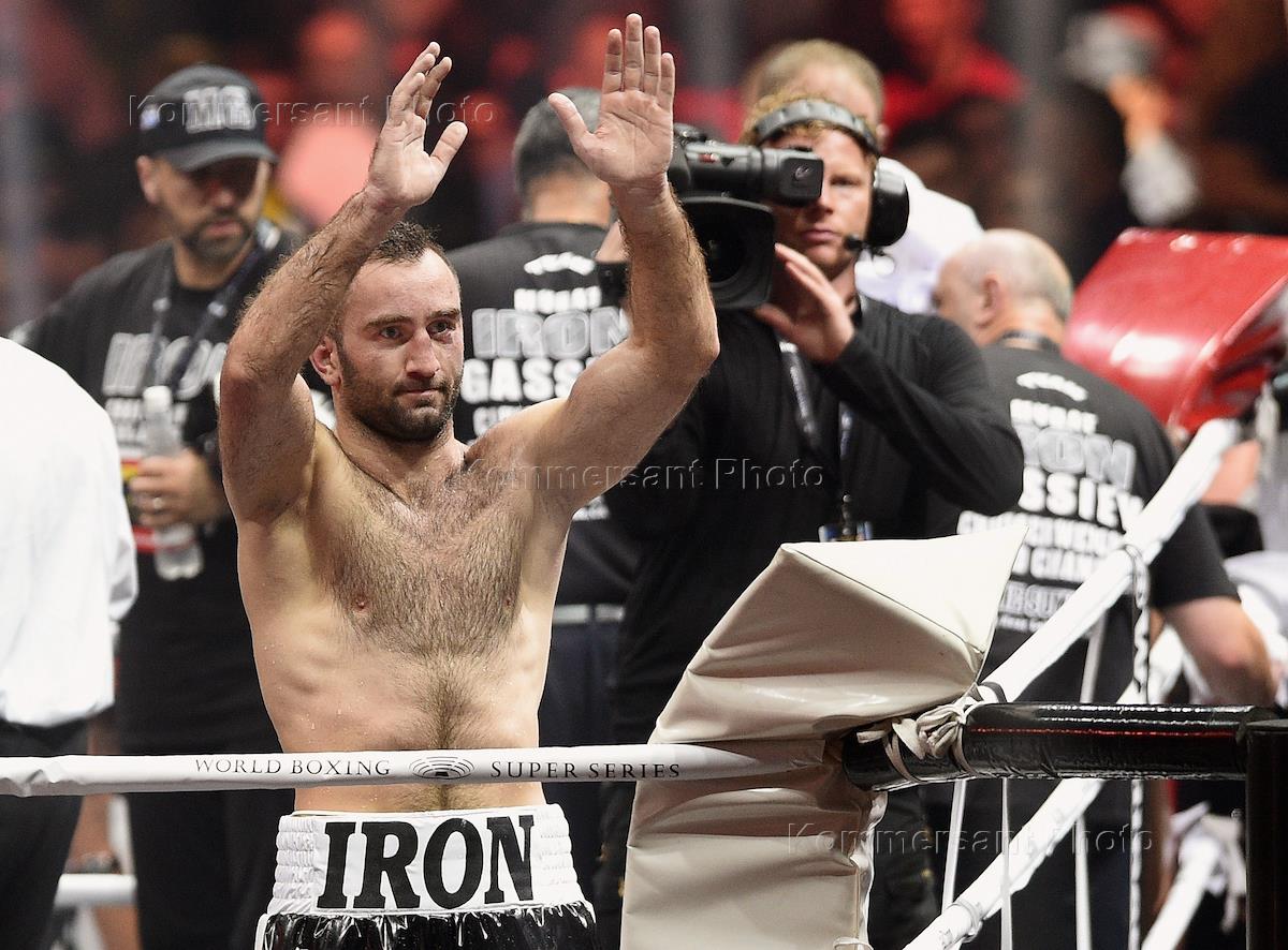Всемирная боксерская суперсерия WBSS за титул чемпиона мира по версиям Всемирного боксерского совета (WBC), Всемирной боксерской организации (WBO), Всемирной боксерской ассоциации (WBA) и Международной боксерской федерации (IBF) в весе до 90,71 кг. Финал. Российский боксер Мурат Гассиев после окончания объединительного боя в спортивном комплексе "Олимпийский".