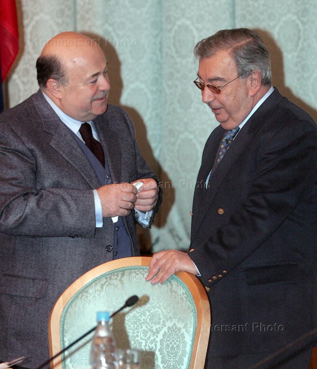 Президент "Альфа-банка" Петр Авен (слева) и президент Республики Северная Осетия (Алания) Александр Дзасохов (справа) на заседании Всероссийского общественного комитета по поддержке пострадавших в результате террористического акта в Беслане. Заседание прошло в "Президент-Отеле".