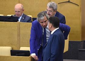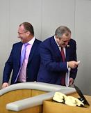 Пленарное заседание Государственной думы (ГД) России. Член комитета ГД России по делам Содружества Независимых Государств, евразийской интеграции и связям с соотечественниками Юрий Мищеряков (справа) и член Комитета ГД по информационной политике, информационным технологиям и связи Евгений Ревенко (слева) перед началом заседания.