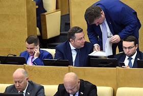 Пленарное заседание Государственной думы (ГД) России. Член комитета ГД России по транспорту и строительству Максим Сураев (слева) и член комитета ГД России по обороне Владимир Богодухов (справа) перед началом заседания.