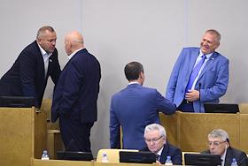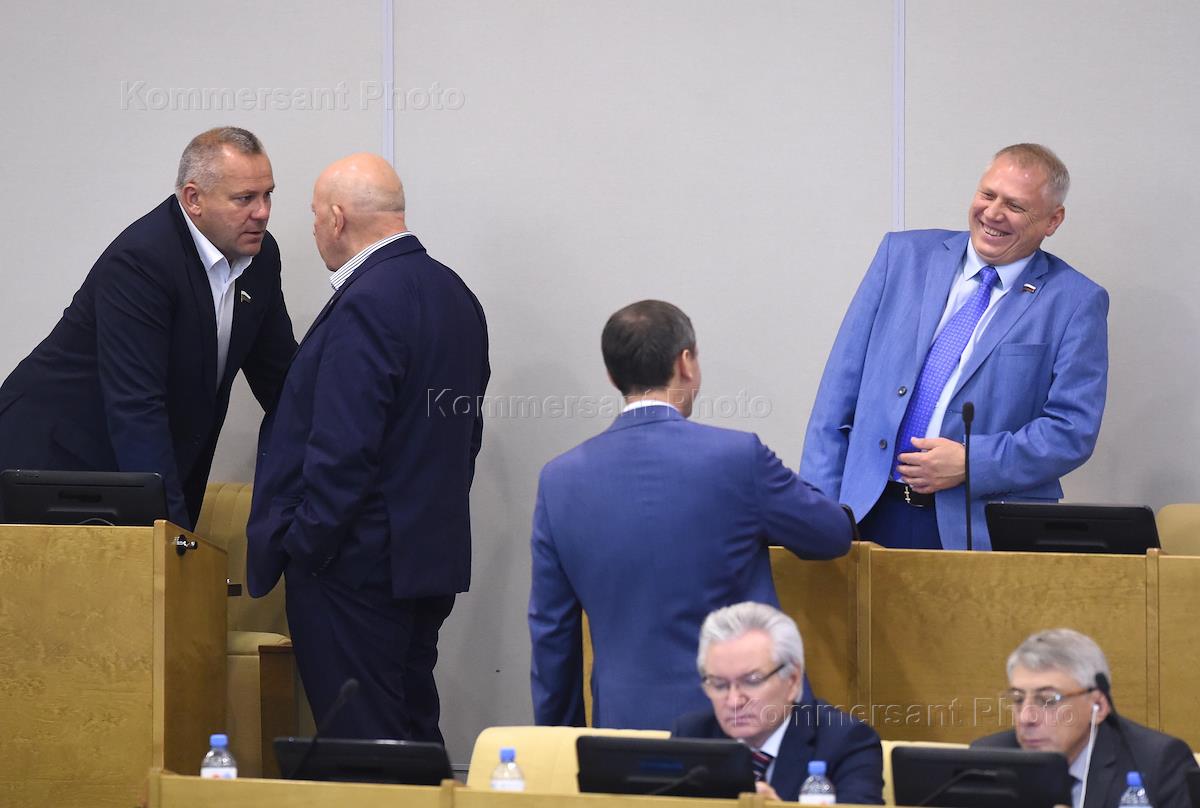 Пленарное заседание Государственной думы (ГД) России. Слева направо: заместитель председателя комитета ГД по культуре Олег Лавров, председатель комитета ГД России по труду, социальной политике и делам ветеранов Ярослав Нилов, член комитета ГД по транспорту и строительству Александр Старовойтов, член комитета ГД по международным делам Антон Морозов и член комитета ГД России по федеративному устройству и вопросам местного самоуправления Юрий Волков перед началом заседания.