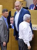 Пленарное заседание Государственной думы (ГД) России. Член Комитета ГД по вопросам депутатской этики Сергей Иванов (слева), первый заместитель председателя комитета ГД по экологии и охране окружающей среды Николай Валуев (в центре) и член комитета ГД по охране здоровья Абдулмажид Маграмов (справа) перед началом заседания.