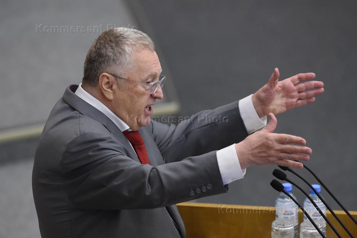 Srping session press-conference of Russian State Duma. Leader of LDPR political party Vladimir Zhirinovsky (right) before the press-conference.