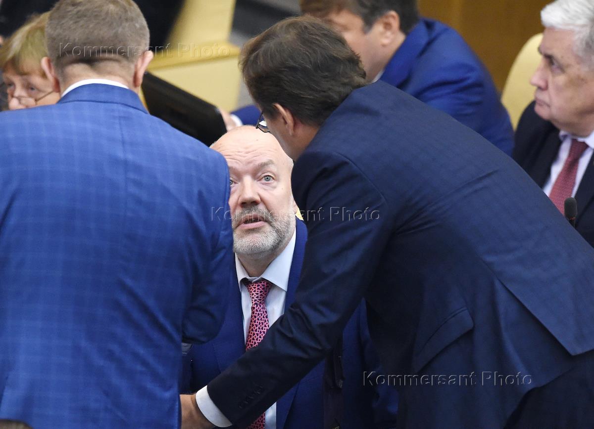 Пленарное заседание Государственной думы (ГД) России. Слева направо: член комитета ГД России по федеративному устройству и вопросам местного самоуправления Равиль Хуснулин, член комитета ГД России по природным ресурсам, собственности и земельным отношениям Алексей Воевода и член комитета ГД России по информационной политике, информационным технологиям и связи Максим Кудрявцев перед началом заседания.