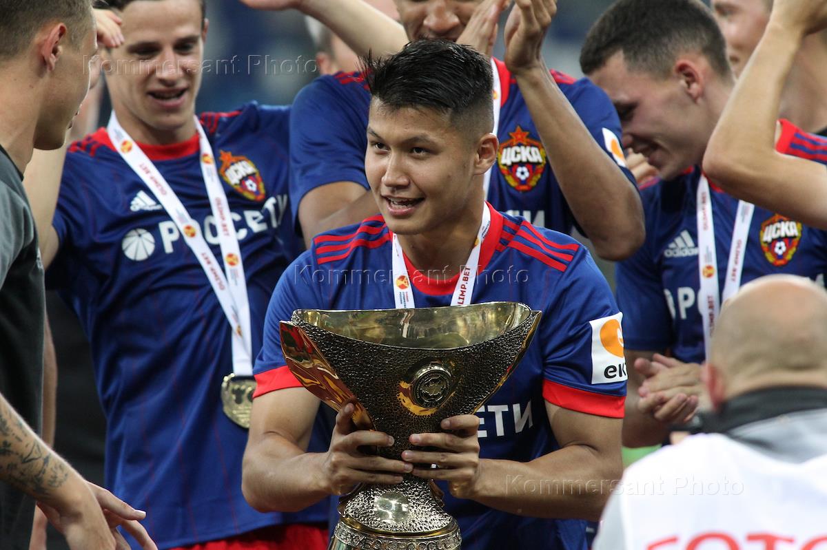 Олимп - Суперкубок России по футболу. Матч между командами "Локомотив" (Москва) и ЦСКА (Москва) прошел на стадионе "Нижний Новгород". Игрок команды ЦСКА Ильзат Ахметов (в центре) во время церемонии награждения.