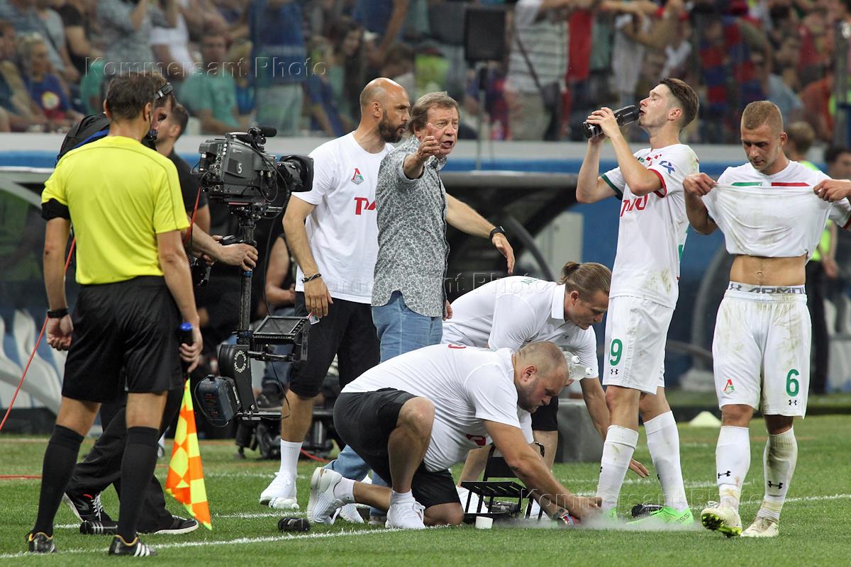 Олимп - Суперкубок России по футболу. Матч между командами "Локомотив" (Москва) и ЦСКА (Москва) прошел на стадионе "Нижний Новгород". Главный тренер команды ЦСКА Виктор Гончаренко (слева) и игрок команды "Локомотив" Владислав Игнатьев (справа) во время матча.
