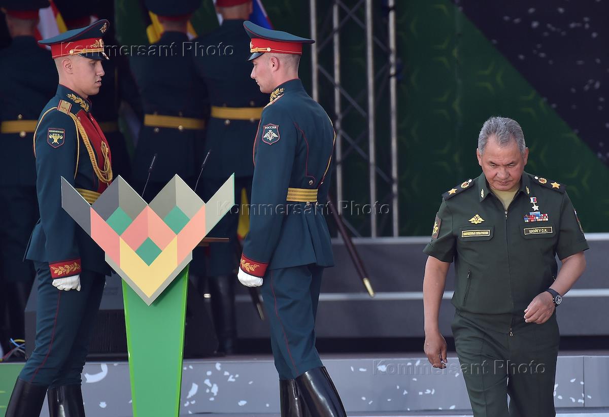 Торжественная церемония открытия Армейских международных игр "АрМИ-2018" и 1-й этап конкурса "Танковый биатлон" прошли на территории военного полигона "Алабино". Министр обороны России Сергей Шойгу во время церемонии.