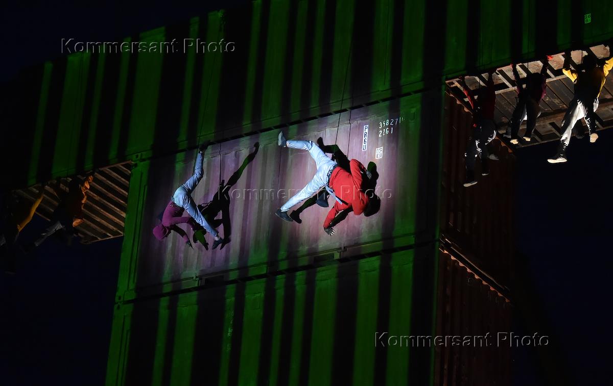 Жанровая фотография. Останкинская башня на фоне темного неба во время международного фестиваля искусств "Вдохновение 2018" на ВДНХ. Спектакль "Waterlitz" театра Generik Vapeur.