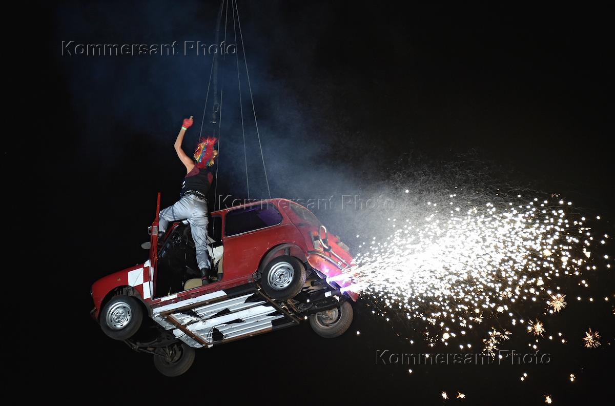 Жанровая фотография. Останкинская башня на фоне темного неба во время международного фестиваля искусств "Вдохновение 2018" на ВДНХ. Спектакль "Waterlitz" театра Generik Vapeur.
