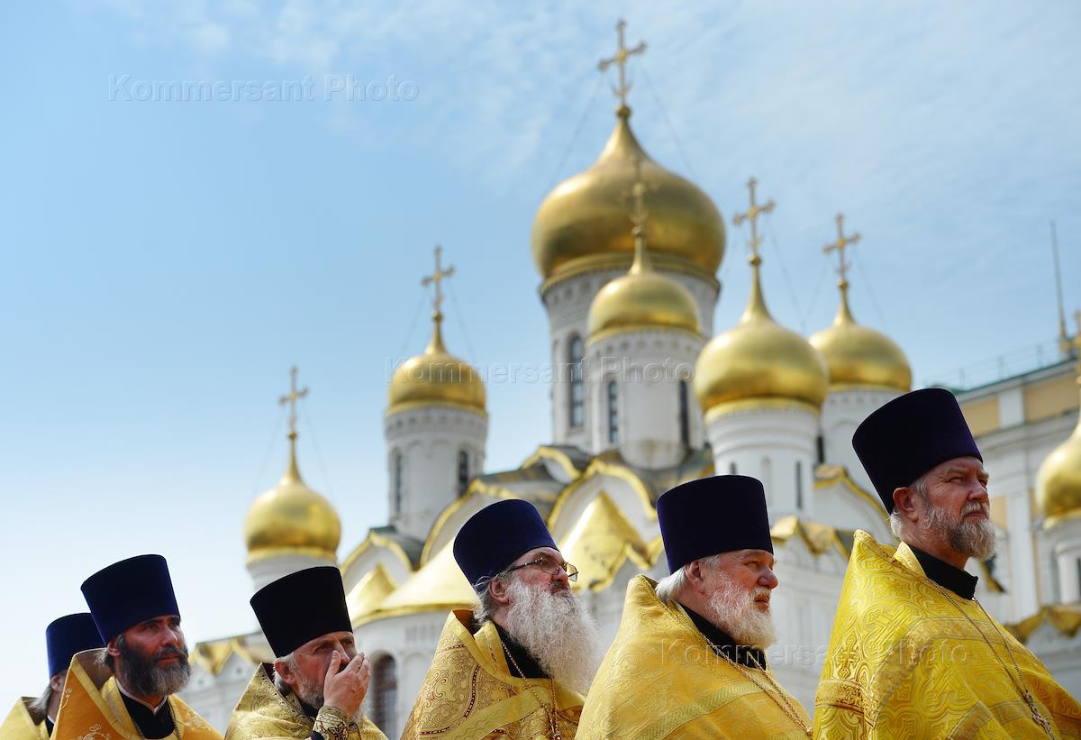 1030 celebration of Kievan Rus' Baptism and Memorial Day of Vladimir the Great. Prayers before the Liturgy on Sobornaya Square of Moscow Kremlin.