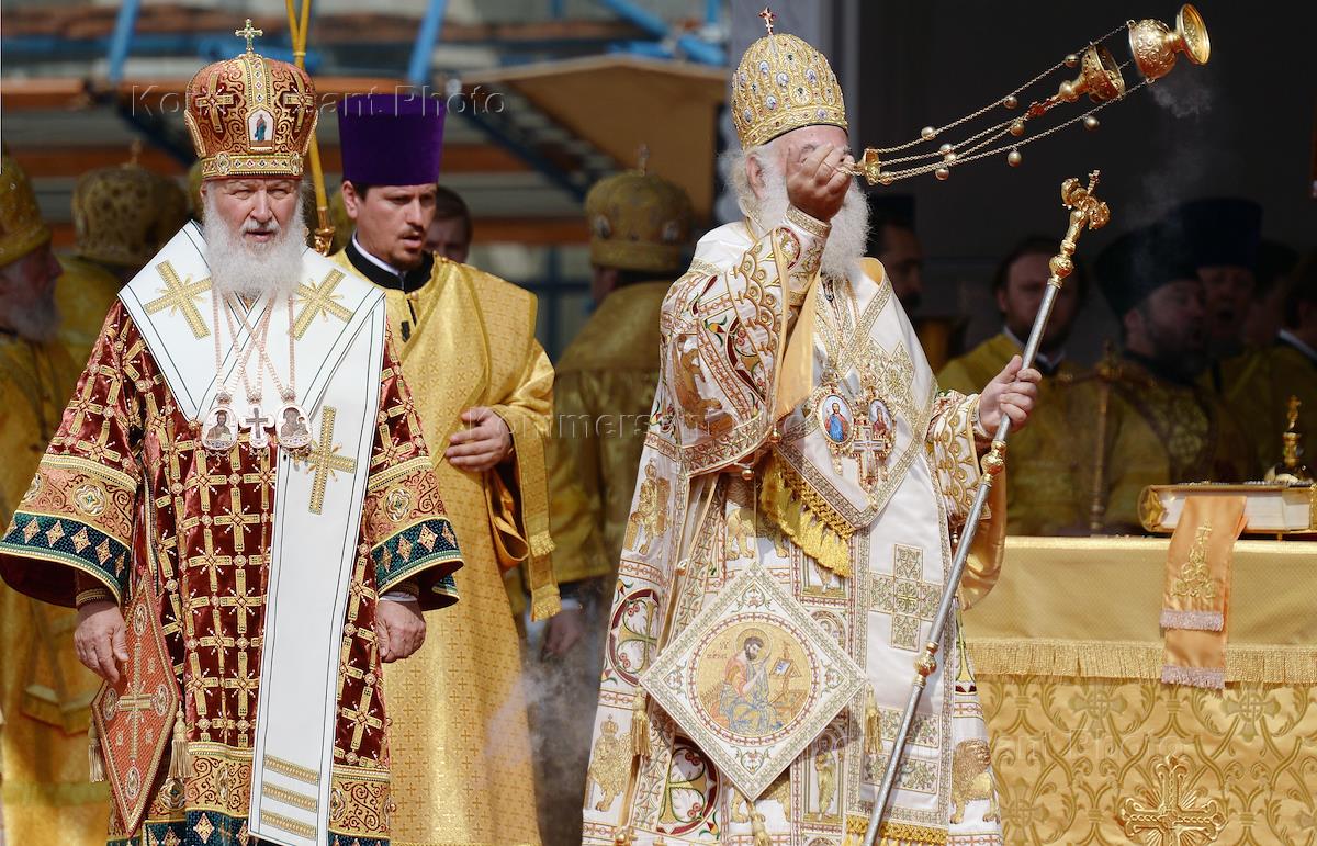 День празднования 1030-летия Крещения Руси и День памяти святого равноапостольного князя Владимира. Патриарх Московский и Всея Руси Кирилл (справа) во время божественной литургии на Соборной площади Московского Кремля.