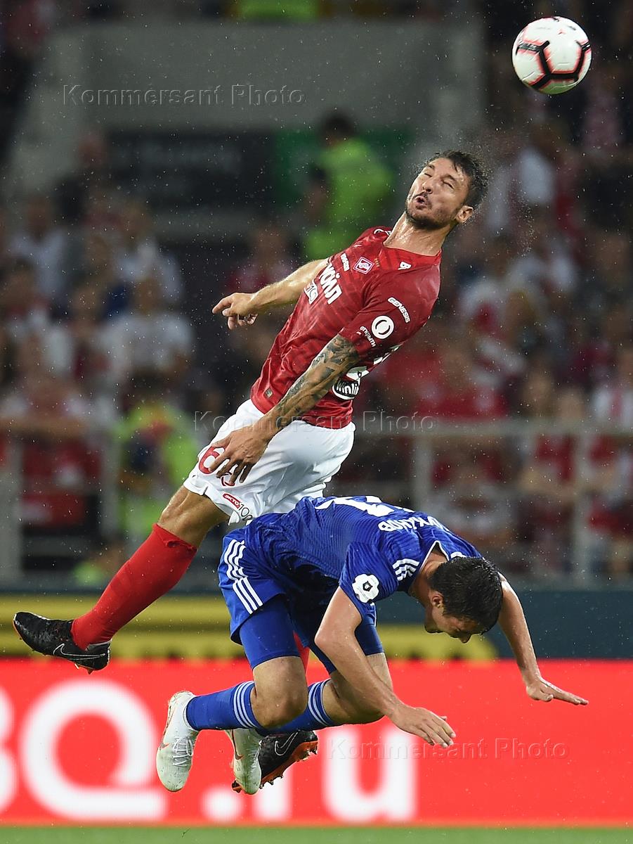 Russian football Cup 2018/2019. First tour. Match between Spartak football team and Orenburg football team at Otkritie Arena stadium. Spartak football player Ze Luis (left) and Orenburg football player Silvije Begich (right) during the match.