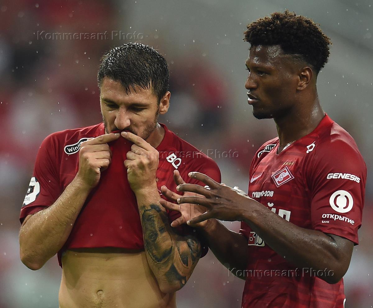 Russian football Cup 2018/2019. First tour. Match between Spartak football team and Orenburg football team at Otkritie Arena stadium. Spartak football players Salvatore Bokketti (left) and Ze Luis (right) during the match.