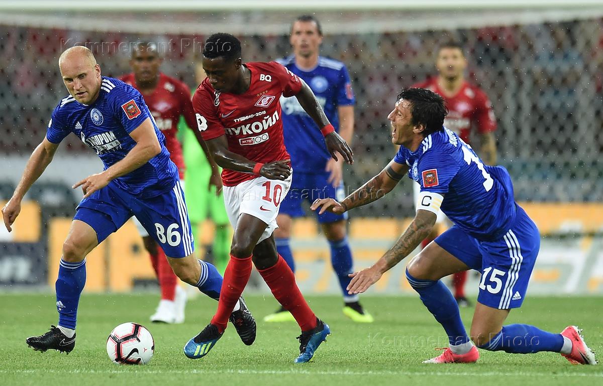 РОСГОССТРАХ - Чемпионат России по футболу 2018/2019. 1 тур. Матч между командами "Спартак" (Москва)и "Оренбург" (Оренбург) прошел на стадионе "Открытие Арена". Игрок команды "Спартак" Зе Луиш (второй справа), игроки команды "Оренбург" Евгений Фролов (слева) и Адесойе Ойеволе (второй слева) во время матча.