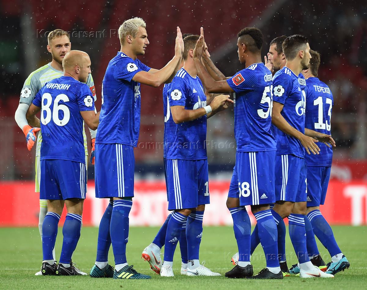 РОСГОССТРАХ - Чемпионат России по футболу 2018/2019. 1 тур. Матч между командами "Спартак" (Москва)и "Оренбург" (Оренбург) прошел на стадионе "Открытие Арена". Игроки команды "Оренбург" во время матча.
