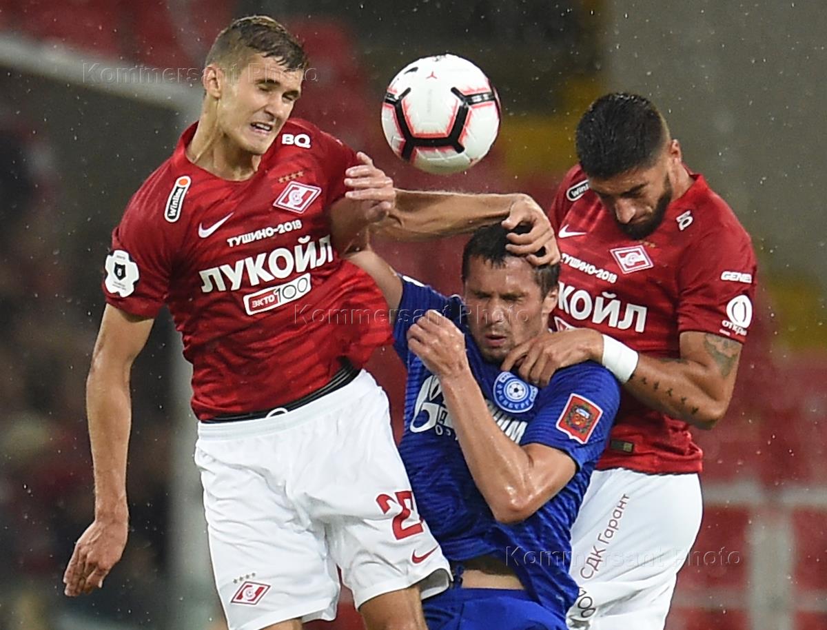 Russian football Cup 2018/2019. First tour. Match between Spartak football team and Orenburg football team at Otkritie Arena stadium. Spartak football player Dmitry Kombarov (center) and Orenburg football player Vadim Afonin (right) during the match.