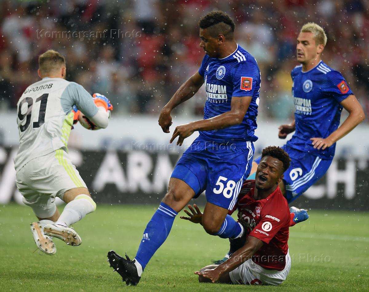 Russian football Cup 2018/2019. First tour. Match between Spartak football team and Orenburg football team at Otkritie Arena stadium. Spartak football player Samuel Zhigo (left) during the match.